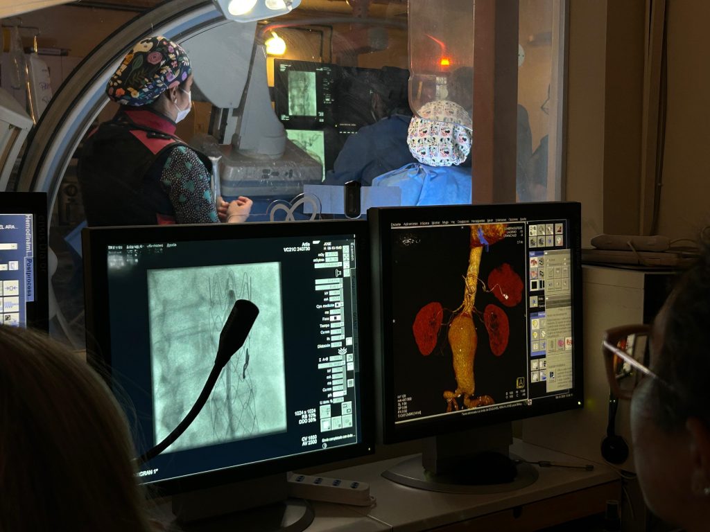 Una vez completado el primer tiempo quirúrgico, se dio paso a la segunda etapa, liderada por cirugía vascular. Esta consistió en una reparación endovascular de la aorta torácica (TEVAR), procedimiento que se realiza introduciendo una endoprótesis por el interior del sistema arterial. Estas prótesis se despliegan dentro de la aorta, reforzando la pared desde su interior y excluyendo la zona dañada del flujo sanguíneo. En este caso, se logró cubrir el arco aórtico, parte de la aorta ascendente y la aorta descendente, estabilizando completamente la lesión.