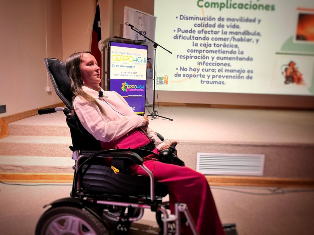Entre los testimonios que marcaron la jornada fue el de Katharina Pavletich, una mujer de 38 años, oriunda de la Región de Coquimbo, quien fue la primera persona diagnosticada en Chile con Fibrodisplasia Osificante Progresiva (FOP), una enfermedad extremadamente poco frecuente. Sus síntomas comenzaron en la infancia y el diagnóstico tardó varios años en llegar, tras una extensa búsqueda médica dentro y fuera del país, hasta que finalmente se confirmó mediante estudios genéticos en el extranjero.