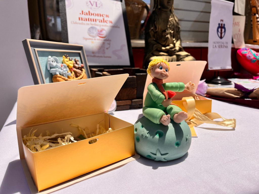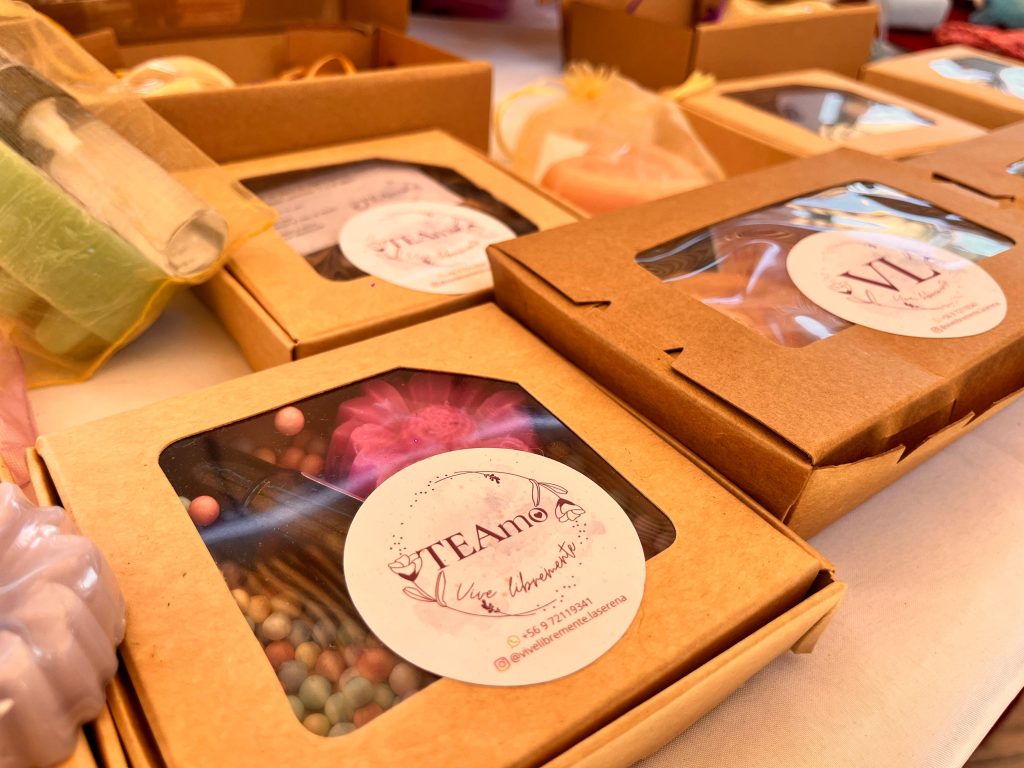 En el caso de Vania, su trabajo se centra en la cosmética natural, donde siendo usuaria del Hospital de La Serena, comenzó a elaborar jabones y productos utilizando aceites, fragancias y colorantes de origen vegetal, además de plantas maceradas por ella misma. El proceso es completamente artesanal y lo desarrolla en familia, junto a sus nietos, quienes la acompañan en la fabricación y en la búsqueda de insumos. Recientemente incorporó una línea orientada al bienestar emocional, con productos pensados para favorecer la calma o la activación durante el día.