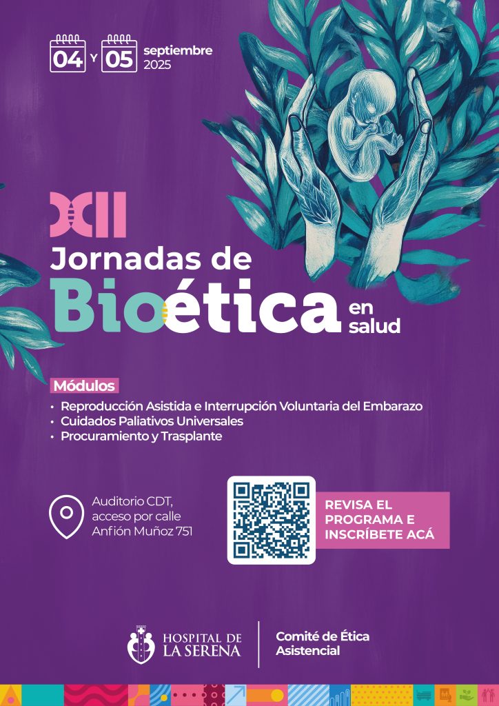 Durante el 04 y 05 de septiembre de 2025 (auditorio CDT, nivel -3), compartiremos conocimientos, reflexiones y preguntas que nos movilizan como personas y profesionales, abrazando a la ética con el cuidado. Una instancia abierta a la red asistencial de la Región de Coquimbo.
