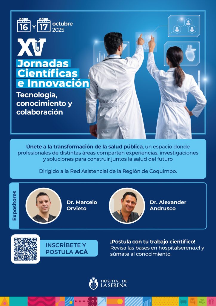 El Hospital de La Serena impulsando el desarrollo de nuevos conocimientos en materia de salud, invita a toda la red asistencial de la Región de Coquimbo a ser parte de las XV Jornadas Científicas e Innovación, un espacio de encuentro y reflexión sobre los avances en salud y tecnología aplicada.